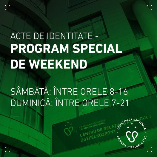 Având în vedere alegerile prezidențiale din 4 și 18 mai, informăm populația că Serviciul Public Comunitar Local de Evidență a Persoanelor și casieria Primăriei Municipiului Miercurea-Ciuc vor primi și în zilele de sâmbătă și duminică persoanele cu drept de vot care nu dețin un act de identitate valabil.